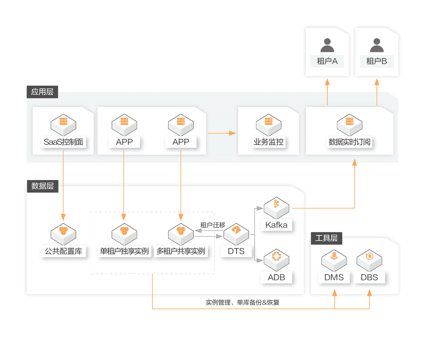 本架构采用大租户独享数据库实例,小租户共享数据库实例。通过数据库和业务监控,可以灵活地把业务增长快的租户从共享实例迁移到独享实例。并且可以为租户提供实时数据订阅、实时报表、个性化备份和恢复服务。SaaS控制面通过集成DMS企业版实现数据库研发和运维自动化。